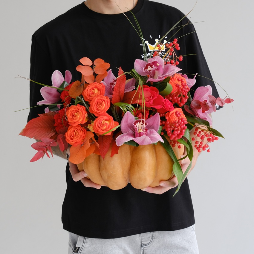 Букет собран в декоративной тыкве, цветы установлены в специальную флористическую пену - оазис. Необходим ежедневный полив.