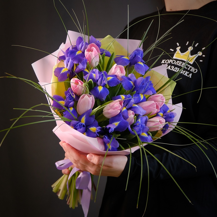 Нежный весенний букет, сочетающий королевские ирисы и розовые тюльпаны. Идеальная композиция для подарка на День рождения или романтическое свидание.