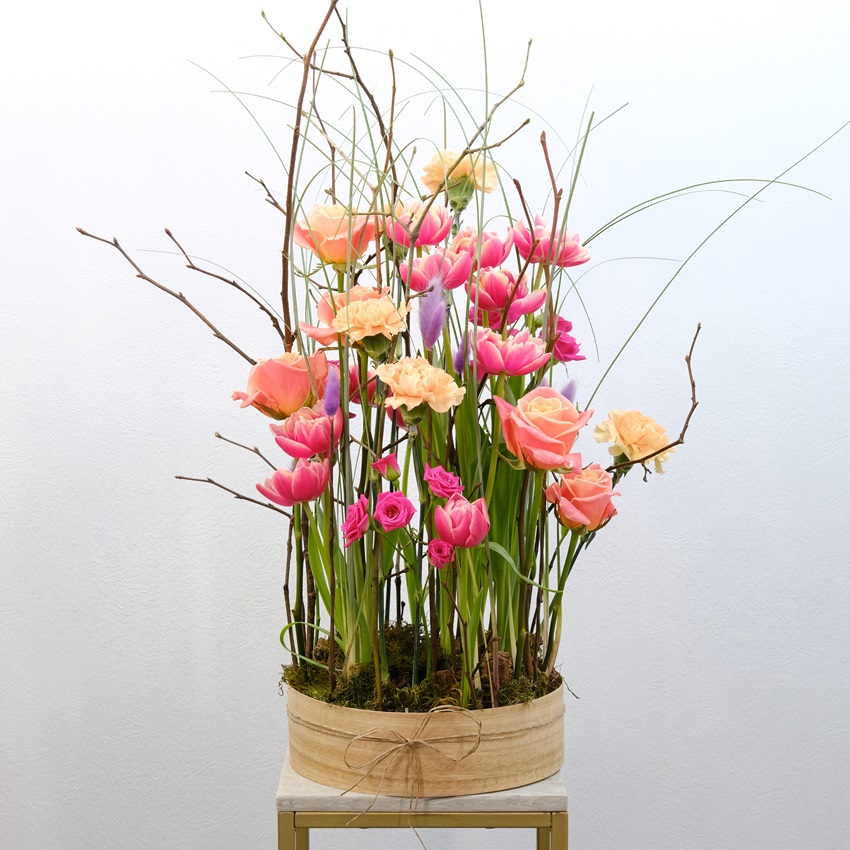 Эффектная вертикальная композиция с декоративными ветками, тюльпанами и розами.