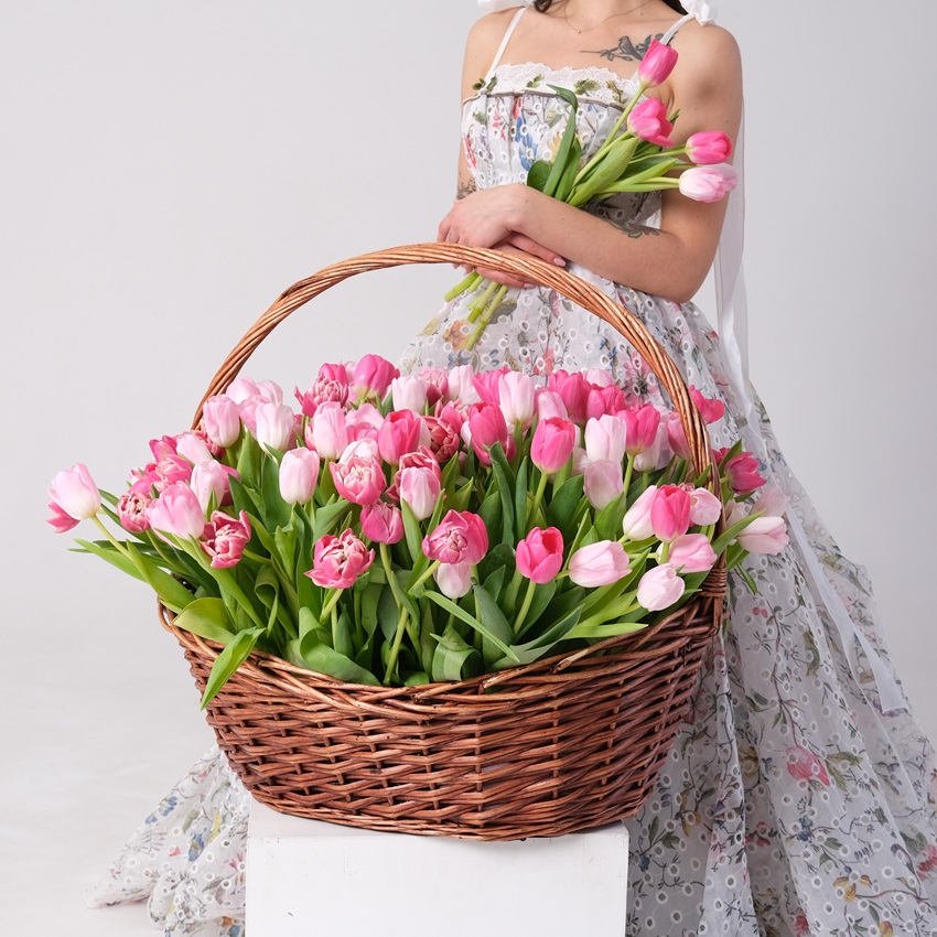 Эти изысканные весенние цветы, собранные в красивую плетеную корзину, создадут невероятную, торжественную атмосферу.