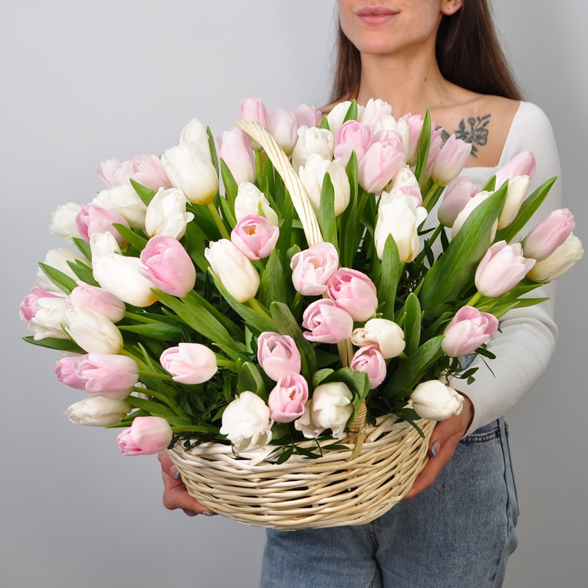 Нежный микс тюльпанов в подарочной корзине, оригинальный и стильный подарок, который подарит весеннее настроение!