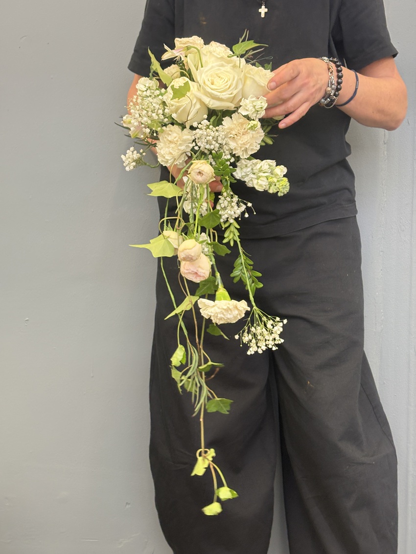 Букет невесты с невероятным эффектом! Смешение нескольких техник сборки: классический круглый букет с ниспадающими выбросами. Идеально подходит для невест, которые ценят изысканность и элегантность. Цветы и цветовое сочетание выберем индивидуально для вас, в зависимости от вашего образа и предпочтений.