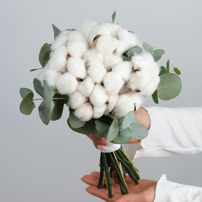 Хлопок в букете олицетворяет невинность и чистоту, а эвкалипт — свежесть и молодость. Такое сочетание делает букет не только красивым аксессуаром, но и символом нового начала и гармонии в семейной жизни.