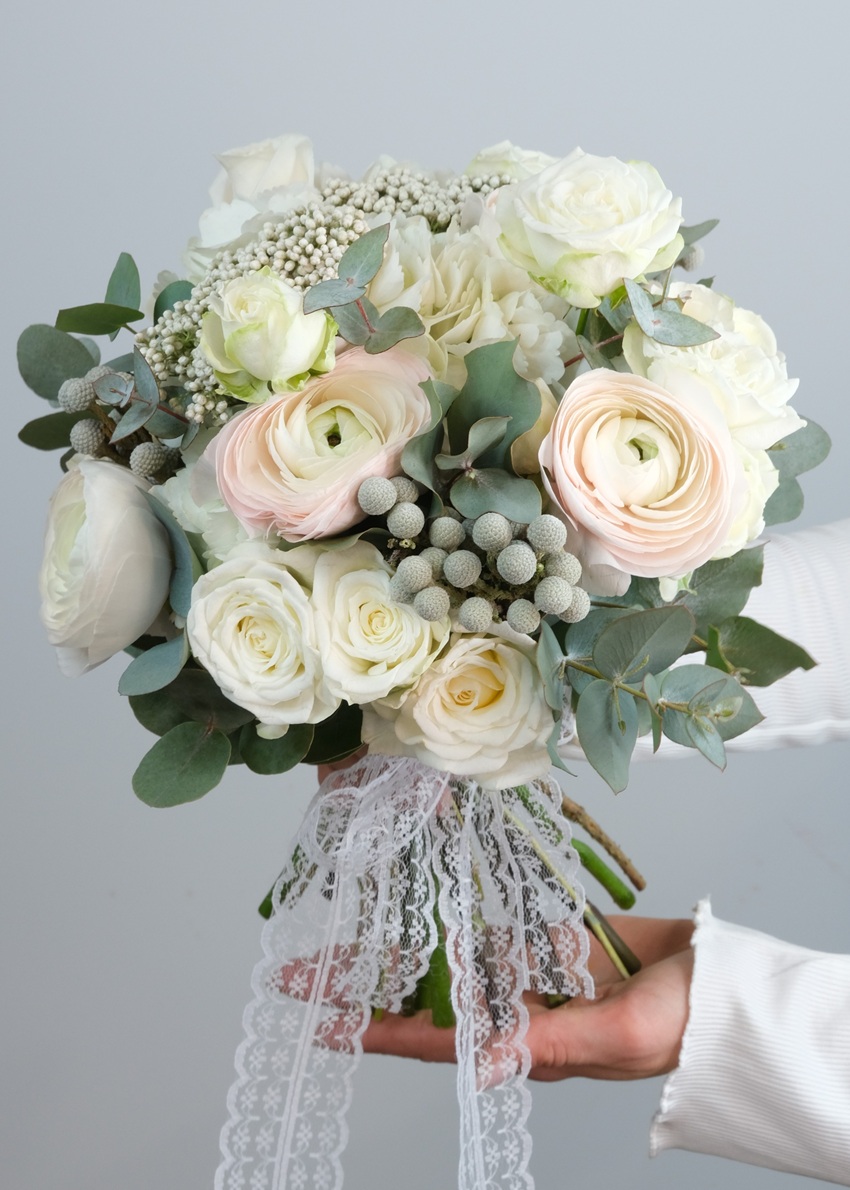 Этот изящный букет из ранункулюсов, роз, брунии и декоративной зелени станет прекрасным акцентом на свадьбе.