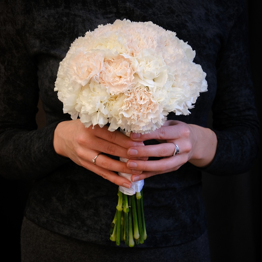 Свадебный букет из белых и кремовых гвоздик сорта Брют. Элегантная монокомпозиция для невесты, которая ценит классику, нежность и долговечность цветов. Букет сохраняет свежий вид на протяжении всей церемонии и фотосессии. Идеально подходит для свадеб в стиле классика, романтика или рустик.